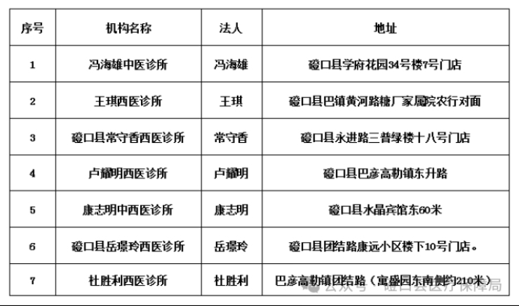 根據《醫療機構醫療保障定點管理暫行辦法》(國家醫療保障局令第2號)的相關規定,磴口縣7家定點醫療機構主動提交定點醫藥機構醫保服務終止申請,現解除上述7家定點醫療機構是醫療保障服務定點協議,取消其醫保定點服務單位資格。名單公示如下: