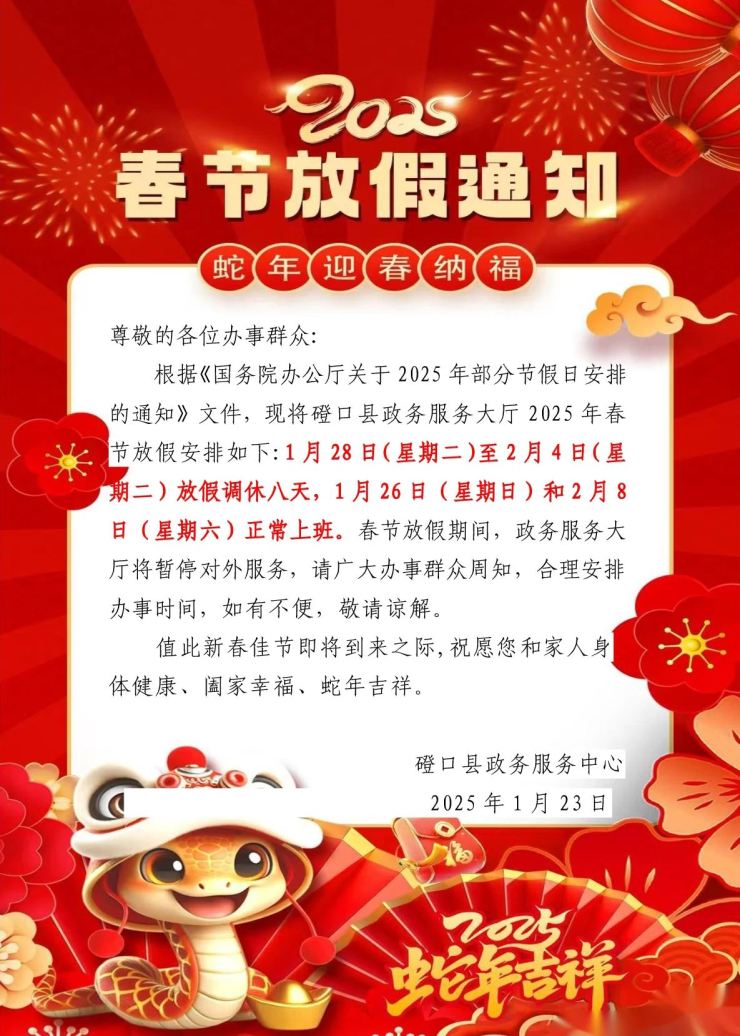 2025年磴口縣政務(wù)大廳春節(jié)放假通知