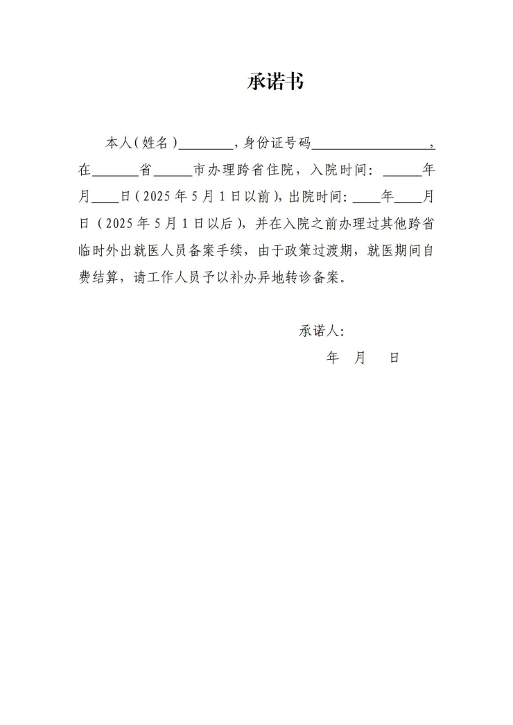 巴彥淖爾市參保人員:根據《轉發自治區醫保局 衛生健康委員會關于印發<內蒙古自治區基本醫療保險跨省異地就醫轉診實施辦法(暫行)的通知>的通知》(巴醫保辦發[2025]28號)文件要求,自2025年5月1日起,辦理其他跨省臨時外出就醫備案人員,在跨省異地轉診就醫人員的支付比例基礎上降低10%。(具體內容詳見此鏈接:跨省異地就醫新政將于5月1日落地執行)為保障我市參保人員的權益,對在5月1日之前在省外辦理住院,并在5月1日以后辦理出院的其他跨省臨時外出就醫人員,可先行自費結算,在參保地醫保經辦窗口補辦異地轉診手續(出具書面承諾書),在參保地醫保經辦窗口進行報銷;如果在省外已經辦理異地直接結算,則不再進行報銷。