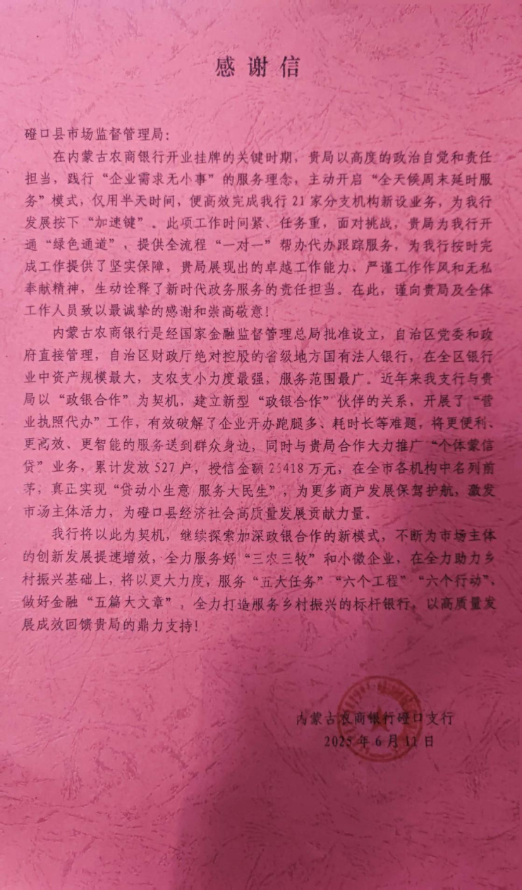 近日,一封飽含深情的感謝信送達磴口縣政務服務大廳。信中,內蒙古農商銀行磴口縣支行高度贊揚了磴口縣市場監督管理局綜合窗口在為其21家分支機構高效辦理新設業務過程中展現的“磴口速度”與“磴口溫度”。