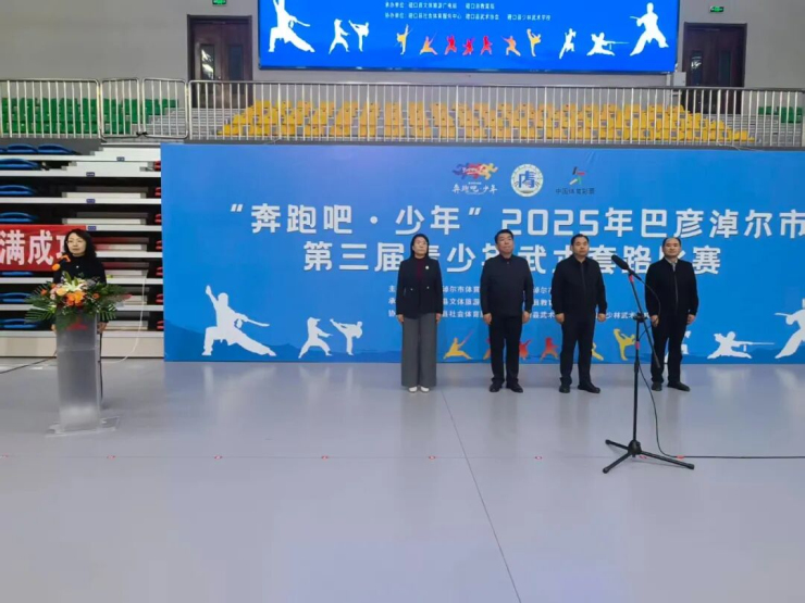 11月1日,“奔跑吧·少年”2025年巴彥淖爾市第三屆青少年武術套路比賽在磴口縣全民健身中心開賽。來自全市各旗縣區青少年武術愛好者6支代表隊近200人參加了此次比賽。出席開幕式的領導有:巴彥淖爾市體育局副局長唐智榮,磴口縣政府副縣長唐東年,市體育局競體科科長包力,磴口縣文體旅游廣電局黨組書記賈新霞,縣文體旅游廣電局副局長王海霞,縣教育局副局長馬玉軍。