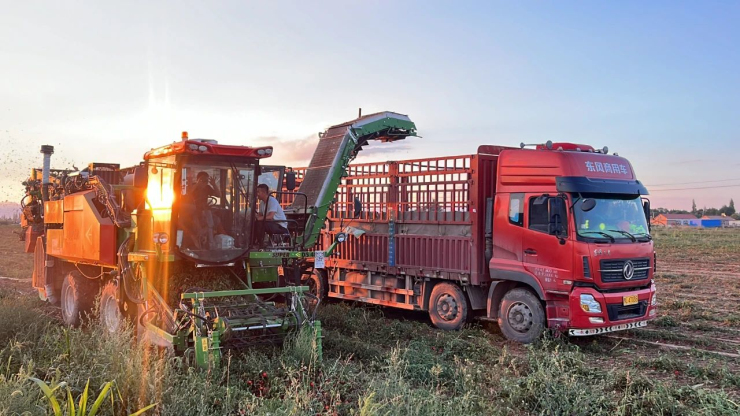 近日,隆盛合鎮海崗村的番茄已進入成熟期,在豐收的田野上,海崗村的機產番茄正以其獨特的魅力,綻放出耀眼的光芒,番茄采收機與拉運車密切配合,在田間穿梭,轉眼間就將番茄裝滿車廂,現場一派喜人的豐收景象。