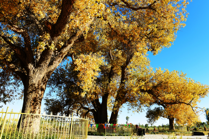 這3株胡楊樹屬自然生長,最大的一株樹圍達4米多。由于周圍都是鹽堿化十分嚴重的土地,很少有其它樹木能這么生機盎然,因此,這也為幾株胡楊樹平添了幾分神秘的色彩,加之,胡楊樹生長年代久遠,又相當茂盛,于是被當地人尊為神樹。古往今來,不斷有當地群眾紛至沓來,給它披紅掛彩、擺放供品、燒香磕頭、頂禮膜拜、求藥治病、祈佑平安。據當地人講,他們向古胡楊求得的以落葉為主的神藥很靈,治愈過好多病。其實,胡楊樹本身會分泌出大量的胡楊堿在葉片上,能治療人體的多種疾病,而在人們沒弄清楚其中的科學道理時,胡楊樹也就自然被神話了。