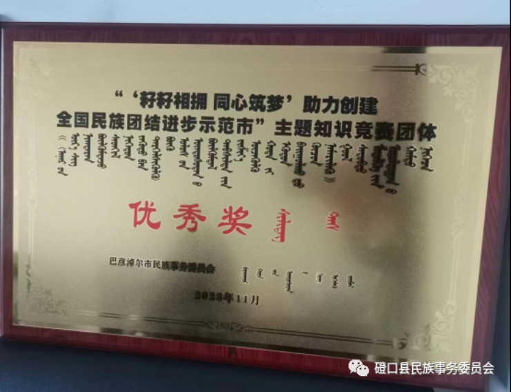 知識競賽以黨的民族理論政策,黨的二十大精神,習近平總書記關于加強和改進民族工作的重要思想,習近平總書記考察內蒙古、考察巴彥淖爾的重要講話重要指示精神,巴彥淖爾市第五屆委員會第五次全體會議精神,巴彥淖爾市創建“全國民族團結進步示范市”攻堅方案,《中國共產黨統一戰線工作條例》,《內蒙古自治區促進民族團結進步條例》為主要內容,設置必答題、搶答題、風險題三個環節。比賽中,每一位選手都以飽滿的精神狀態和扎實的理論功底沉著應戰、積極答題,展現出積極向上和奮發有為的精神風貌,獲得了現場評委和觀眾的熱烈掌聲。整場比賽氣氛熱烈、高潮迭起、精彩紛呈,達到了“以賽促學、以學促踐”的目的。經過激烈角逐,磴口縣民委代表隊獲得獲得第四名好成績,磴口縣參賽隊員伊茹很榮獲優秀答題員。