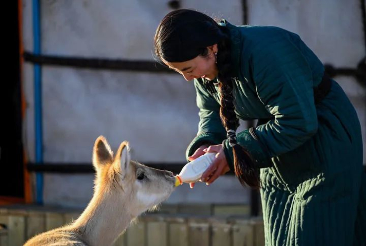 內(nèi)蒙古錫林郭勒盟蘇尼特左旗的蒙古族牧民烏伊汗給小黃羊“蹦潑來”喂牛奶(2022年1月13日攝)。新華社記者 連振 攝