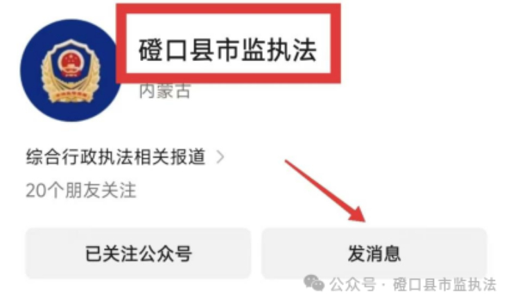 1. 進入【磴口縣市監(jiān)執(zhí)法】微信公眾號,點擊【發(fā)信息】