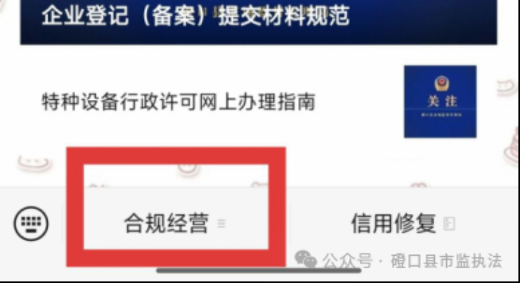 為進一步優(yōu)化營商環(huán)境,提升企業(yè)辦事便利度,磴口縣市場監(jiān)督管理局官方公眾號【磴口縣市監(jiān)執(zhí)法】上線“合規(guī)經(jīng)營”服務(wù)模塊,該模塊聚焦群眾高頻辦事需求,整合五大核心功能,助力“少跑腿、快辦事、防風(fēng)險”,實現(xiàn)一站式合規(guī)指導(dǎo)。