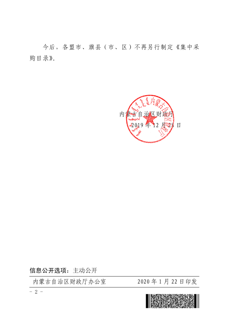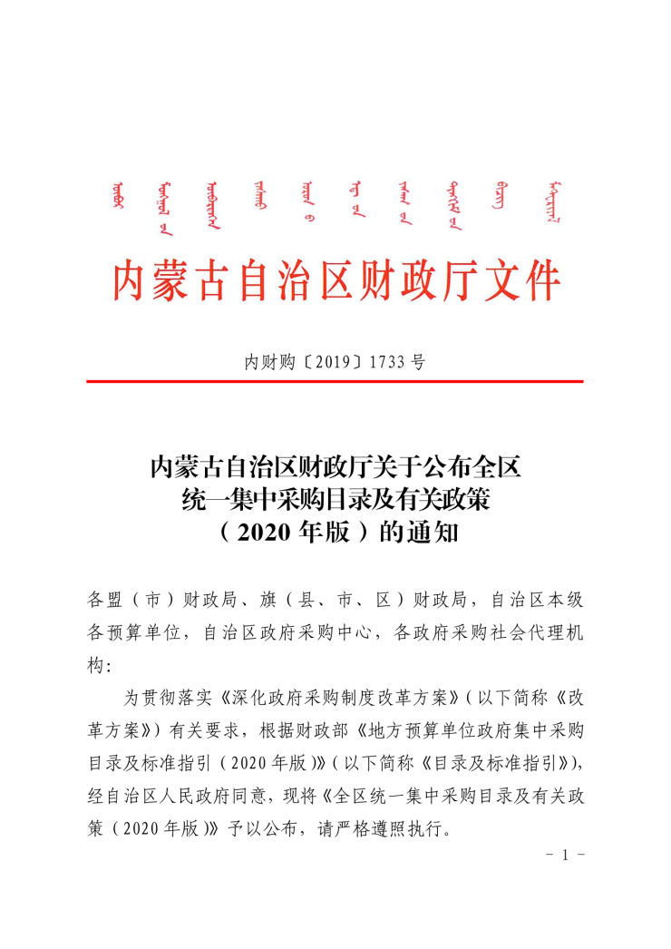 【轉載】內蒙古自治區財政廳關于公布全區統一集中采購目錄及有關政策 (2020 年版)的通知