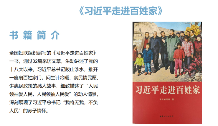 磴口縣圖書館副館長(zhǎng)崔洋向大家推薦分享《習(xí)近平走進(jìn)百姓家》一書,共同學(xué)習(xí)“小院的花香,從山里飄向山外”等篇章。
