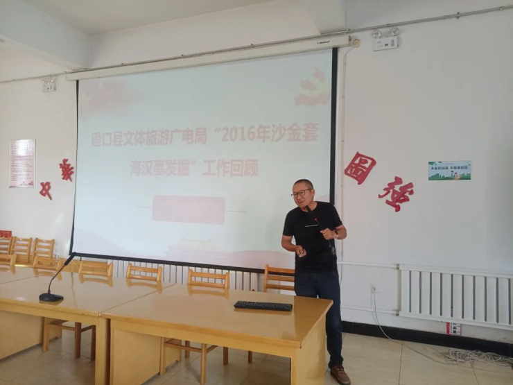 磴口縣文物保護(hù)中心副主任王浩以《2016年沙金套海漢墓發(fā)掘“工作回顧》為題,從對(duì)2016年沙金套海漢代古墓發(fā)掘的地理位置、墓葬形制、隨葬品、人骨鑒定、發(fā)掘收獲等五大方面進(jìn)行了系統(tǒng)的講述。以圖文并茂、實(shí)際案例等方式,生動(dòng)地闡述了發(fā)掘的漢代古墓對(duì)于研究以窳渾縣古城遺址為代表的部都尉治所的漢代北方邊城的軍事、經(jīng)濟(jì)、文化等具重大意義。講座內(nèi)容豐富,通俗易懂,對(duì)磴口的文物發(fā)掘及保護(hù)工作具有很強(qiáng)的指導(dǎo)性和針對(duì)性。