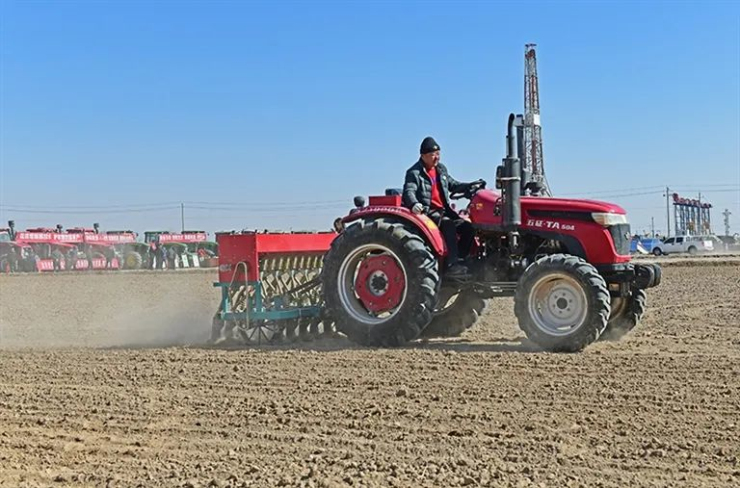 話音剛落,轟鳴聲起。農機手開動播種機,兩排機械臂不斷將麥種和肥料均勻播入泥土中。一次次起落叩響大地,喚醒了河套的生機與活力。