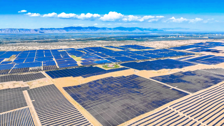 在蒙能85萬千瓦光伏+生態治理項目區,一列列光伏矩陣向沙漠深處延伸,片片深藍色光伏板熠熠生輝。該項目于去年底并網發電,完成生態治理面積2.6萬畝。