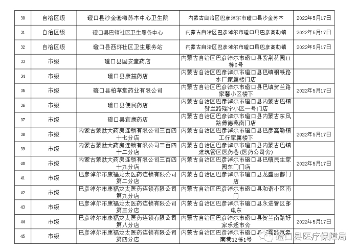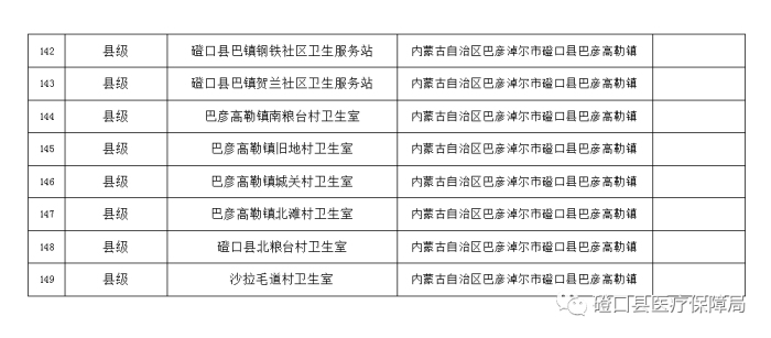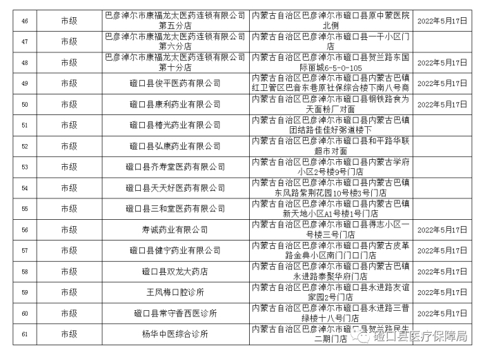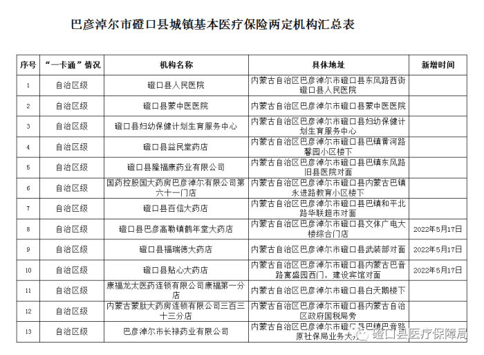 為了適應(yīng)廣大參保人員的需求,進(jìn)一步優(yōu)化我縣營(yíng)商環(huán)境,更好的服務(wù)群眾。按照《關(guān)于進(jìn)一步優(yōu)化全區(qū)定點(diǎn)醫(yī)藥機(jī)構(gòu)申報(bào)工作的通知》(內(nèi)醫(yī)保險(xiǎn)辦發(fā)〔2022〕5號(hào))和《巴彥淖爾市定點(diǎn)醫(yī)藥機(jī)構(gòu)準(zhǔn)入管理辦法》(巴醫(yī)保〔2019〕87號(hào))文件精神,磴口縣醫(yī)療保障局通過(guò)現(xiàn)場(chǎng)勘驗(yàn),同時(shí)結(jié)合日常檢查、考核。現(xiàn)對(duì)磴口縣149家“兩定”醫(yī)藥機(jī)構(gòu)認(rèn)定結(jié)果進(jìn)行公示,名單如下:
