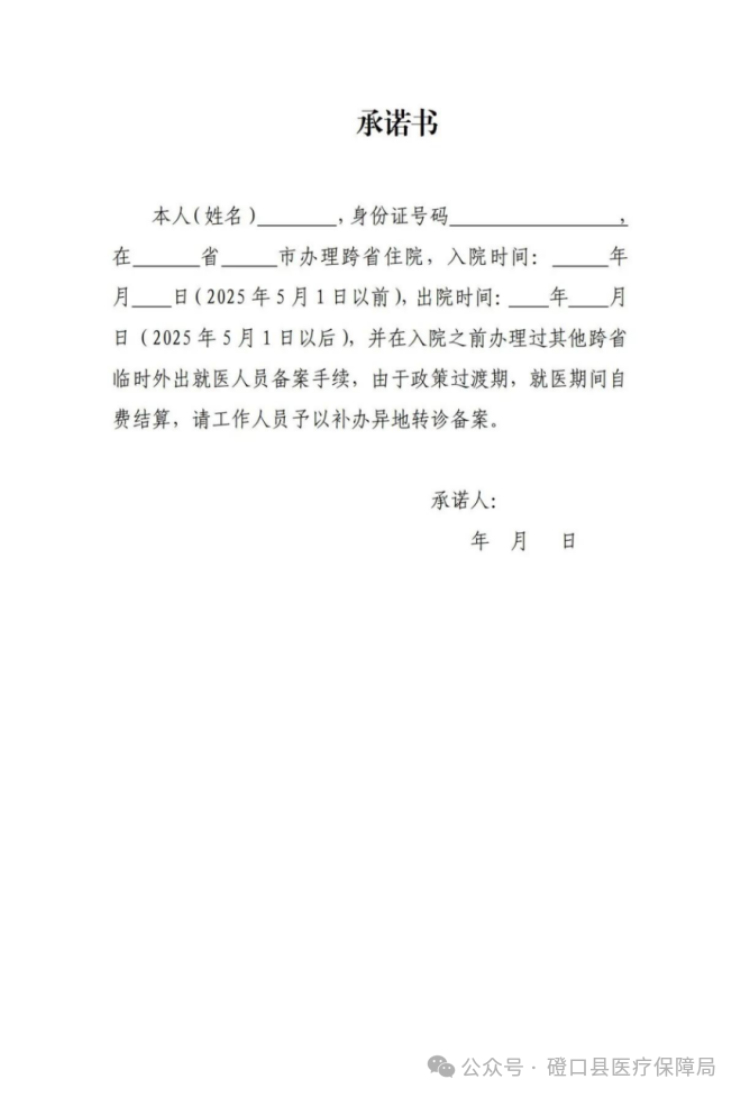 同時為保障我縣參保人員的權益,針對5月1日之前在省外辦理住院,并在5月1日以后辦理出院的其他跨省臨時外出就醫人員,可先行自費結算,在參保地醫保經辦窗口補辦異地轉診手續(出具書面承諾書)詳見附件2,在參保地醫保經辦窗口進行報銷;如果在省外已經辦理異地直接結算,則不再進行報銷。