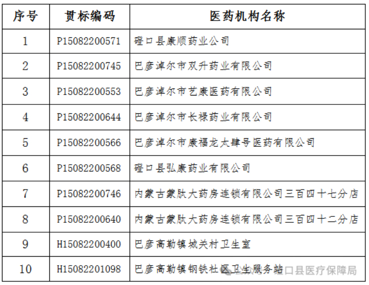 根據《醫療機構醫療保障定點管理暫行辦法》(國家醫療保障局令第2號)、《零售藥店醫療保障定點管理暫行辦法》(國家醫療保障局令第3號)的相關規定,10家定點醫藥機構主動申請解除醫保定點服務協議,目前已解除以下醫藥機構的醫療保障服務定點協議,取消其醫保定點服務單位資格。
