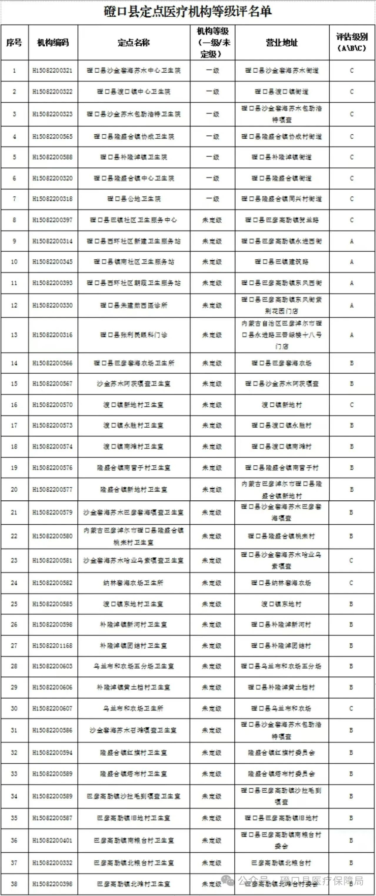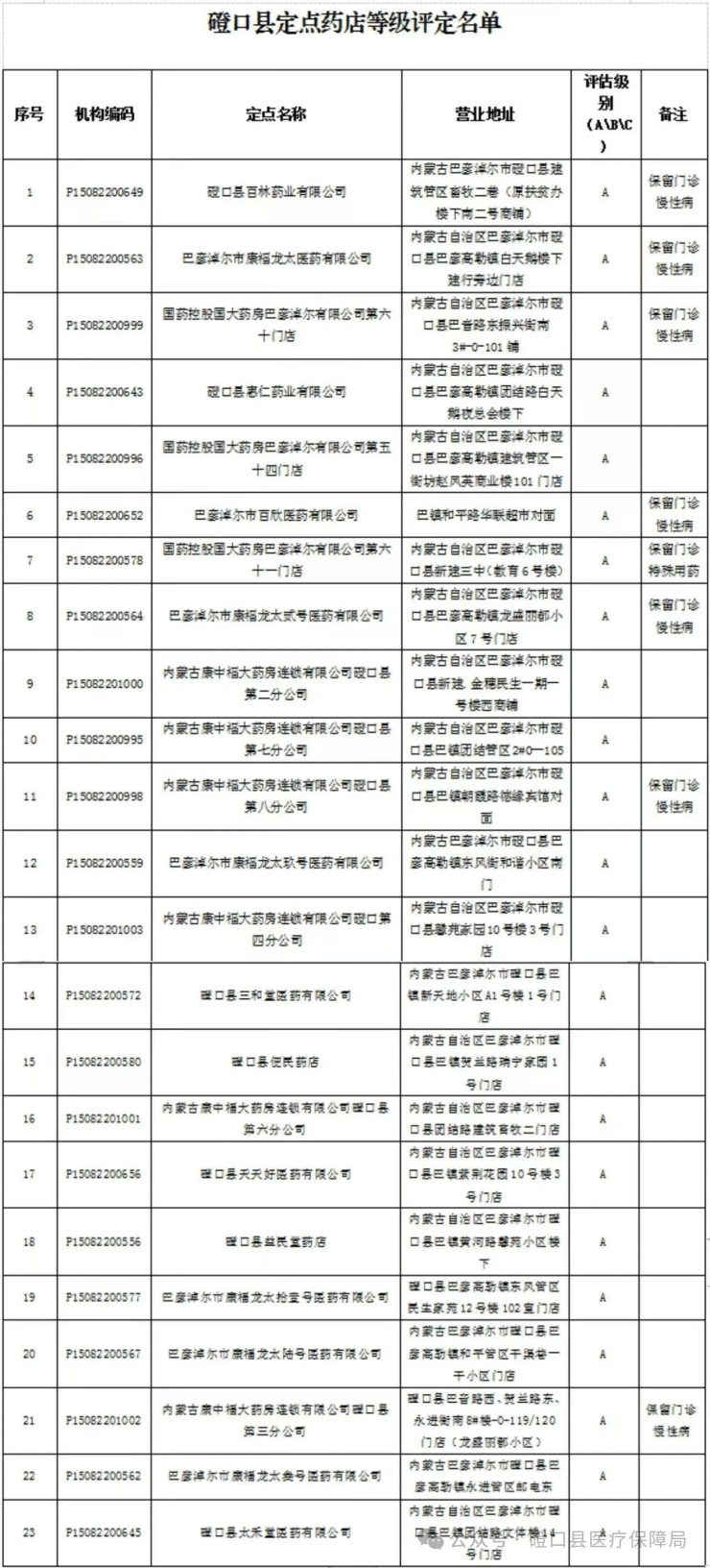為規(guī)范定點醫(yī)藥機構(gòu)管理,切實守護(hù)參保群眾“看病錢”、“救命錢”,根據(jù)《內(nèi)蒙古自治區(qū)醫(yī)療保障局關(guān)于印發(fā)<定點醫(yī)藥機構(gòu)醫(yī)保結(jié)算分級管理辦法(試行)>的通知》(內(nèi)醫(yī)保發(fā)〔2024〕16號)及有關(guān)精神要求,我局對我縣一級及以下定點醫(yī)療機構(gòu)和零售藥店醫(yī)保結(jié)算等級進(jìn)行了評定,現(xiàn)將評定后的全縣38家一級及以下定點醫(yī)療機構(gòu)(A級5家,B級21家,C級12家)和23家A級定點零售藥店結(jié)算等級進(jìn)行公示。