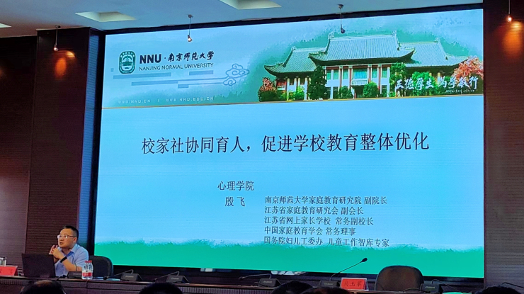 南京師范大學(xué)殷飛教授作了題為《家校社協(xié)同育人 促進(jìn)學(xué)校整體優(yōu)化》的專題講座。他對“雙減”背景下的教育現(xiàn)狀進(jìn)行了分析,闡述了家校合作的意義、作用并提出了可行的策略,呼吁家校雙向理解,共同做孩子成長的引路人、筑夢人。