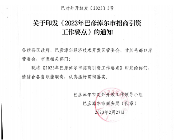 關于印發《2023年巴彥淖爾市招商引資工作要點》的通知
