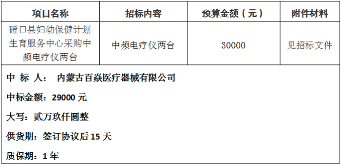 磴口縣婦幼保健計劃生育服務中心采購中頻電療儀兩臺(項目編號:DFYC2022004),于2022 年11月7日9時50分采用院內公開詢價招標方式進行。現就本次詢價采購成交結果公示如下: